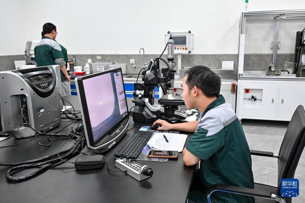 7月4日,在铜陵精达漆包线有限公司,技术人员通过显微镜检测漆包线切面相关数据。