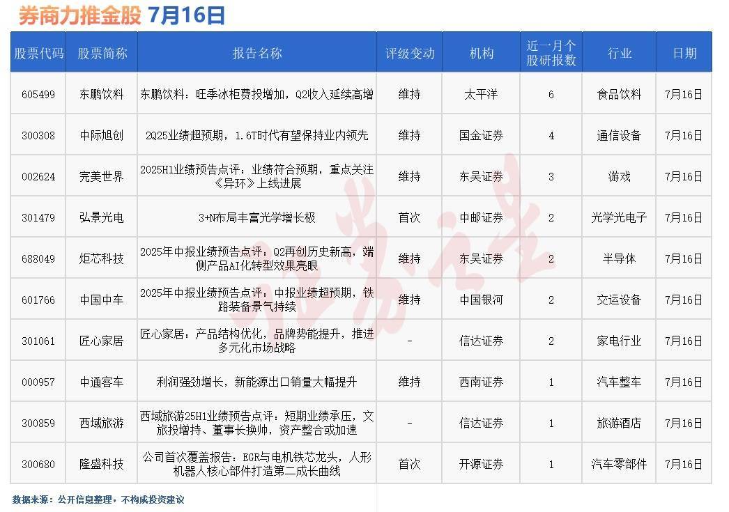 游戏巨头完美世界同样受到券商关注,近一月获群益证券、东吴证券等3份研报关注,位居7月16日券商力推股第三。近日,公司发布业绩业绩预告,2025年上半年预计实现归母净利润4.8-5.2亿元,同比扭亏;扣非后净利润2.9-3.3亿元,同比扭亏;其中Q2单季度预计实现归母净利润1.8-2.2亿元,同比扭亏。