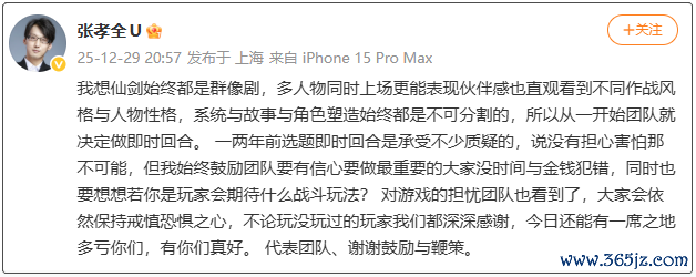 “仙剑始终都是群像剧,多人物同时上场更能表现伙伴感也直观看到不同作战风格与人物性格,系统与故事与角色塑造始终都是不可分割的,所以从一开始团队就选即时回合。”