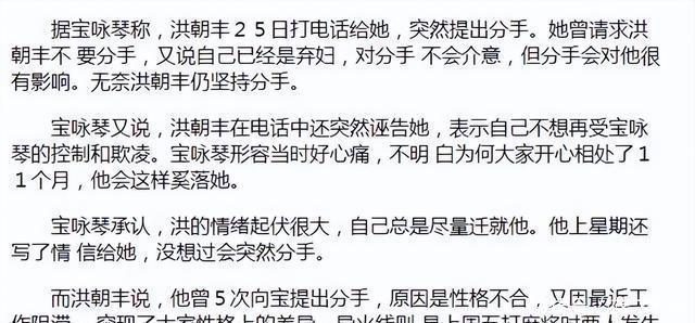 宝咏琴帮他事业扩大,两人上节目秀恩爱,洪朝丰生日她亲他八次。但维持11个月就分手,闹得鸡飞狗跳。洪朝丰开记者会追债100万,还列清单包括39条内裤和2张三级片VCD,要宝咏琴付11亿“陪伴费”。 宝咏琴反击,说他骗感情,是双性恋,在交往中还带男友旅游。洪朝丰说宝咏琴控制欲强,有特殊癖好,两人隐私满天飞。 媒体大呼过瘾,两人复合过,笑称小闹,又分手,洪吼着要“捽死”她,这次彻底诀别。