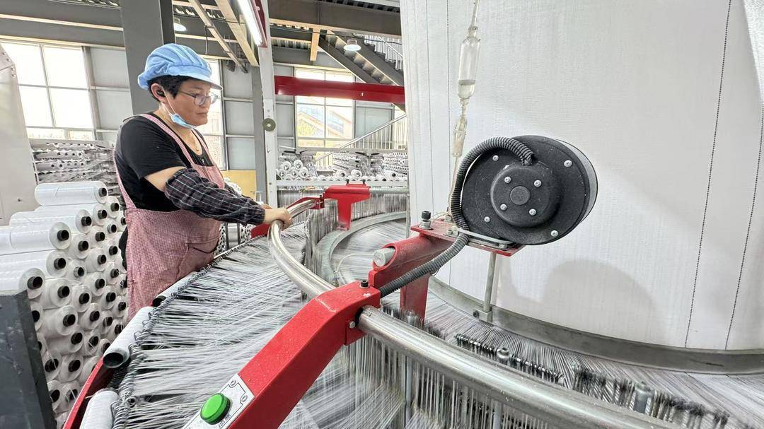 走进刘楼镇伊思特塑业的拉丝工段,只见聚丙烯颗粒通过螺旋送料机进入高温熔炉,经挤压、冷却、牵伸等流程,晶莹的白色细丝从微孔中挤出,被卷绕到一起。